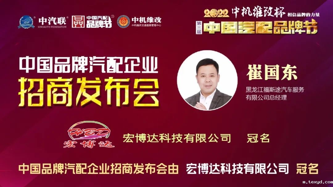 2022年5月31日,“2022 福斯途杯 中国汽配企业品牌秀”的第二场活动,由 宏博达科技有限公司 特约冠名播出的2022中国品牌汽配企业招商发布会在线上成功召开,宏博达科技有限公司COO李宝龙 、宏博达科技有限公司 CGO魏学智、黑龙江福斯途汽车服务有限公司总经理崔国东 、广州广利汽车维修服务有限公司董事长魏本利等嘉宾出席汽配企业品牌秀并做了精彩分享,引起了行业的广泛关注,点赞数量达到102万个。2022中国品牌汽配企业招商发布会由18luck新利快乐彩执行秘书长、中国汽配品牌节常务秘书长徐铭主持。