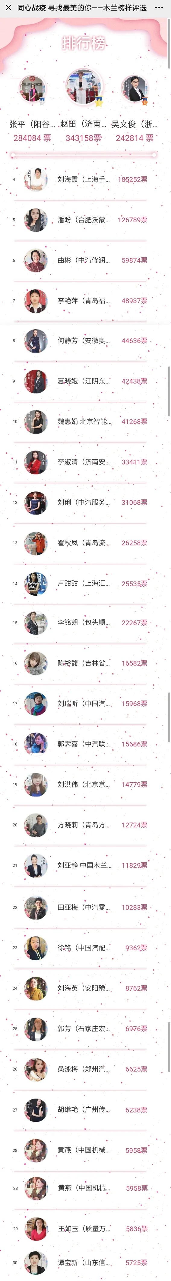 同心战疫,寻找最美的你——“中国木兰人气榜样网络评选”共有150位木兰参与激烈角逐,历时10天,于9月22日24:00已圆满落下帷幕。总访数超过912595人次,总投票数达到1858629票,受到了汽车行业企业家们的广泛关注与积极参与,在汽车行业掀起了一股木兰热潮,纷纷为自己心中的木兰榜样投票,投票系统一再拥堵,前四名争夺战尤其激烈,4人总票数达到了105万票。
