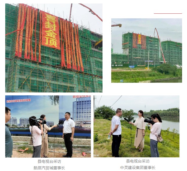 盛夏风光无限好,鄂东大地捷报传。7月17日,湖北航信中部汽贸城安伴环保酒店A32号楼喜封金顶,开发运营单位湖北航信汽贸城董事长李佳良及管理团队,监理单位黄梅县建设工程监理有限公司项目负责人,施工单位湖北中灵建设集团有限公司董事长赵贵强及项目技术团队,相关合作单位及友好单位出席了封顶仪式,县电视台现场采访报道。